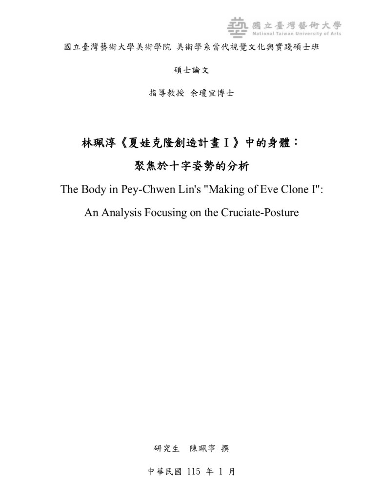 CHEN, PEI-LING,The Body in Pey-Chwen Lin’s “Making of Eve Clone I": An Analysis Focusing on the Cruciate-Posture,thesis of Master’s Program in Contemporary Visual Culture and Practice, Department of Fine Arts, College of Fine Arts, National Taiwan University of Arts, 2026.連結:https://www.academia.edu/161297542/CHEN_PEI_LING_The_Body_in_Pey_Chwen_Lins_Making_of_Eve_Clone_I_An_Analysis_Focusing_on_the_Cruciate_Posture_thesis_of_Master_s_Program_in_Contemporary_Visual_Culture_and_Practice_Department_of_Fine_Arts_College_of_Fine_Arts_National_Taiwan_University_of_Arts_2026