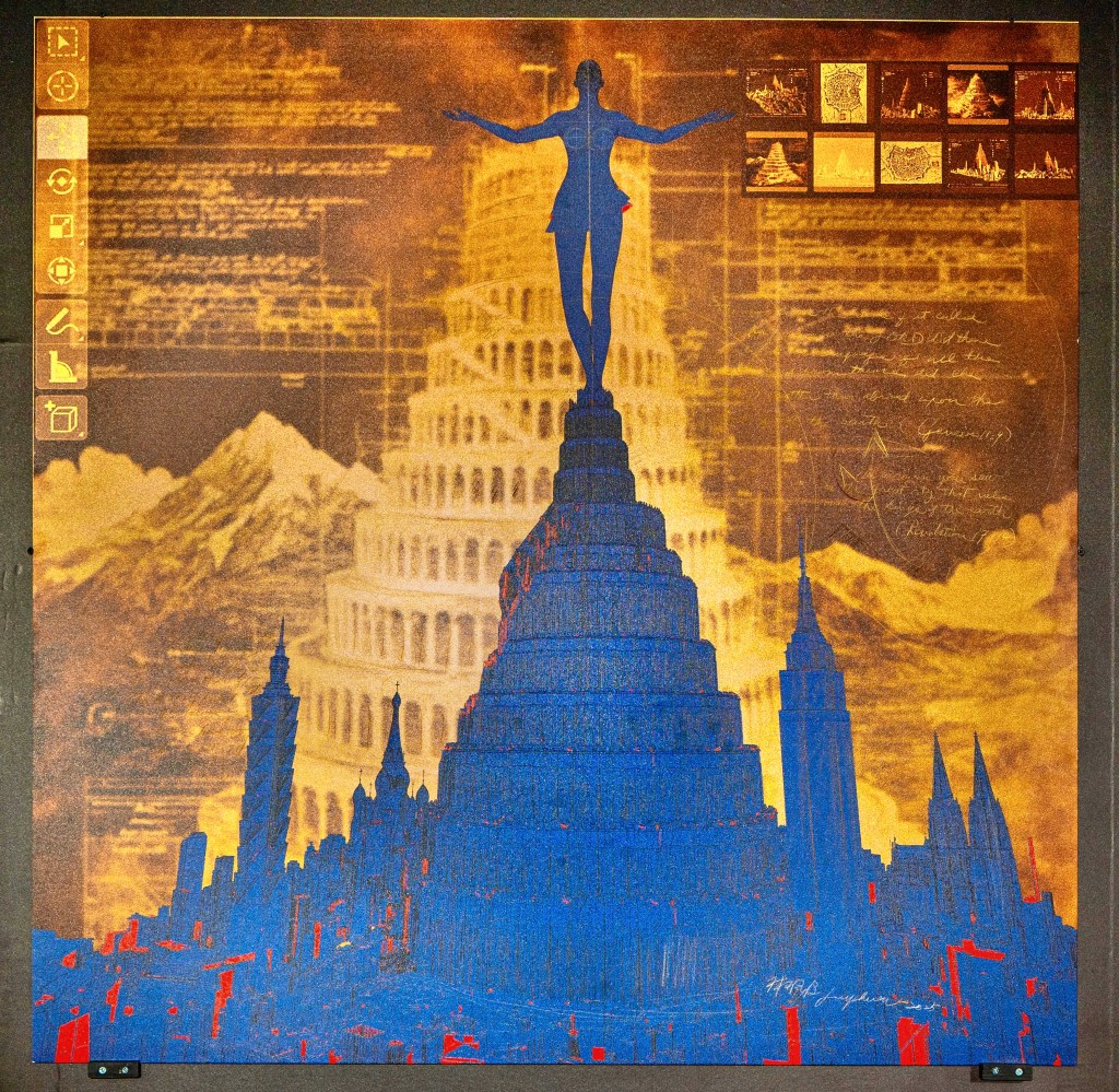 巴別塔之下的藍色網格城市,是藝術家刻意從 Google 地圖中的真實 3D 建築模型所截取而成。這些地標建築包括紐約帝國大廈、台北 101、中正紀念堂、巴黎鐵塔、聯合國總部、歐盟大樓、科隆大教堂、大英圖書館以及紅場等,皆為政治與文化權力的象徵,也凸顯了人類所誇耀之文明所建構出的巨大巴比倫城。