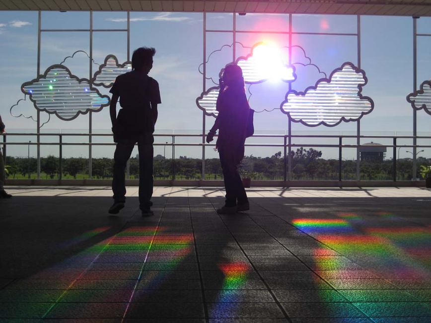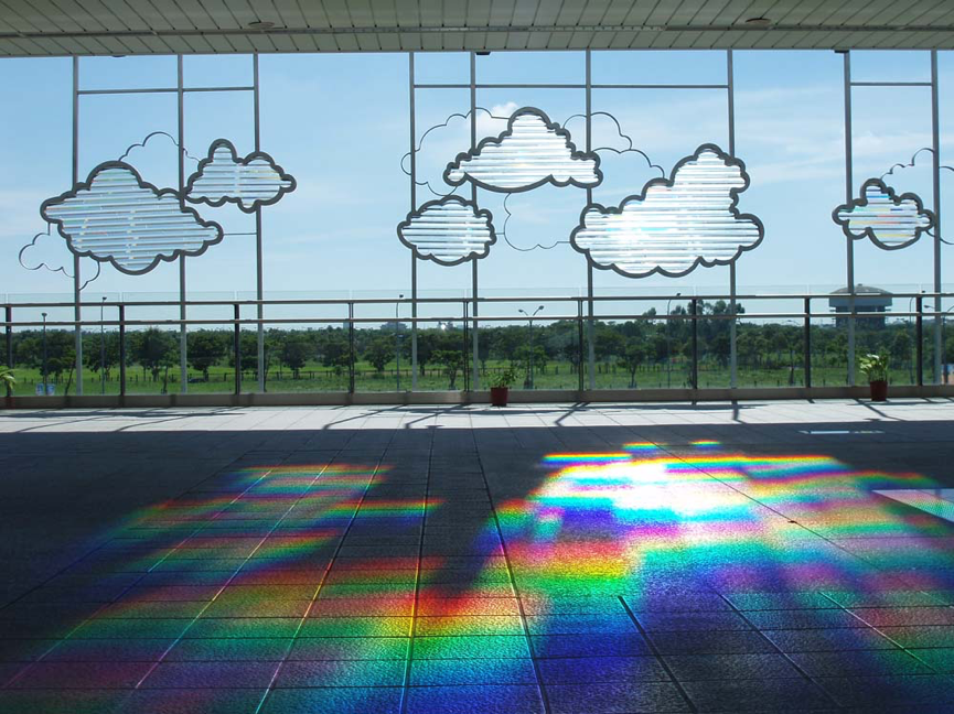 設置三朵立體晶瑩透明如寶石般的雲朵形造形體,掛於可眺望一整片生態綠地的穿堂圍欄上方,雲朵的組成是由一根根三角形透明體構成,尤其在中午過後陽光從西邊長時間經過,光將折射灑落於雲朵前方地面上,因為單位材質及形體關係,此光線將會呈現七彩的光動態游移景象,自然的時間感在光的出現並對應上、以及行進的推移變化,全屬大自然的韻律,而人們在此通道停了下來,和孩子細數種種他們的共同記憶和老一輩人的記憶,然而這裡的時間產生了多重重疊。