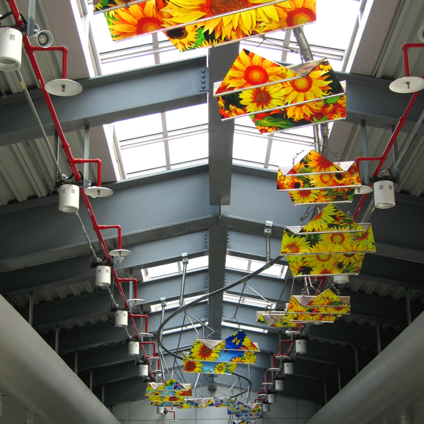 藝術家林珮淳透過作品的切面曲線及造形,來強化作品的細膩柔軟而豐沛的生命能量轉變的意念,將作品垂吊於此場域中,上升時展示象徵通向有生命力的「自然生態」圖像、下行回推象徵有別於其他鄉鎮的「在地文化」圖騰,每一個圖騰都經由藝術家手繪的創作,列印於透明壓克力板上,如代表在地的向日葵花朵、蝴蝶、在地的橋頭老街景象等,並設置於採光罩之下,以表現出透光與輕盈的材質特色,猶如飛鳥般的遷徙與飛翔。