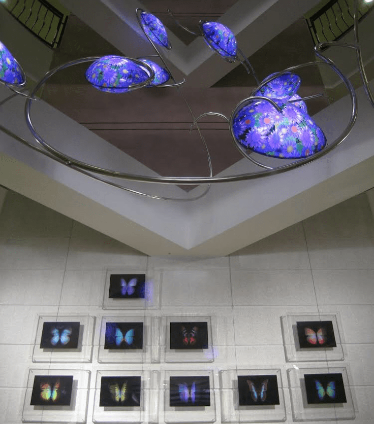 《寶貝#3》公共藝術作品設置於一至三樓「井」字型空間中,以立體壓克力塑模出的鑽石造型,利用不鏽鋼管承載錯綜複雜的電路,將光線引至每一單獨的鑽石造形內,讓光線與作品合為一體,創造出藤蔓與立體紫菊共構的美感。