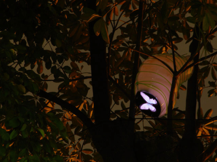 《蛹之生》作品是受邀台北公共藝術節所創作完成的,主要是呼應當地文化特性:雖為老舊的社區,但透過更多的關注在恢復其原有的活力。因此,我將約15顆白色的蛹造型,分別鑲坎於公園內的樹之間。白天只見一顆顆白色的蛹沉睡於陽光下,到了晚上化為一隻隻美麗的蝴蝶,在夜間一閃一爍的活現於樹林中,這是我將冷光片放置於蛹前端以突顯蝴蝶圖像的效果,以企圖詮釋白蛹到了夜間化為彩蝶的奇妙過程,而象徵此社區美麗的未來。