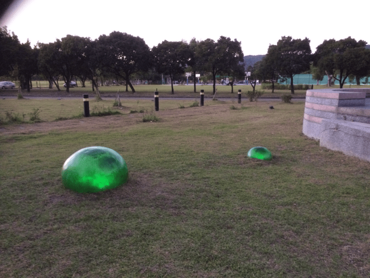 「露珠」以不同尺寸悠然地被放置於公園草坪上,彷彿一顆顆巨大的生命體,一種超乎想像的超現實之美感油然而生,更令人驚艷,尤其夜間LED燈光由露珠內部緩緩發出如呼吸般的燈光表演時,更加吸引人的目光,不管是白天或夜間都散發出與大自然相互對話的生命體。林珮淳藉著非自然材質去創造模擬自然的形體、景象或人工生命,一粒粒的龐大露珠形體具有超現實的吸引力,藉此思考回歸大自然的重要性。
