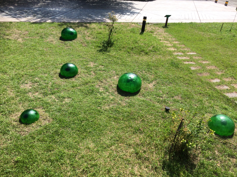 延續「回歸大自然」系列創作,林珮淳利用矽膠材質加注油性染色劑、玻璃纖維、保麗膠來創造九顆模擬自然形態的「露珠」。以台北大學行政大樓的中央廣場前的公園為基地來設置此「露珠」公共藝術。