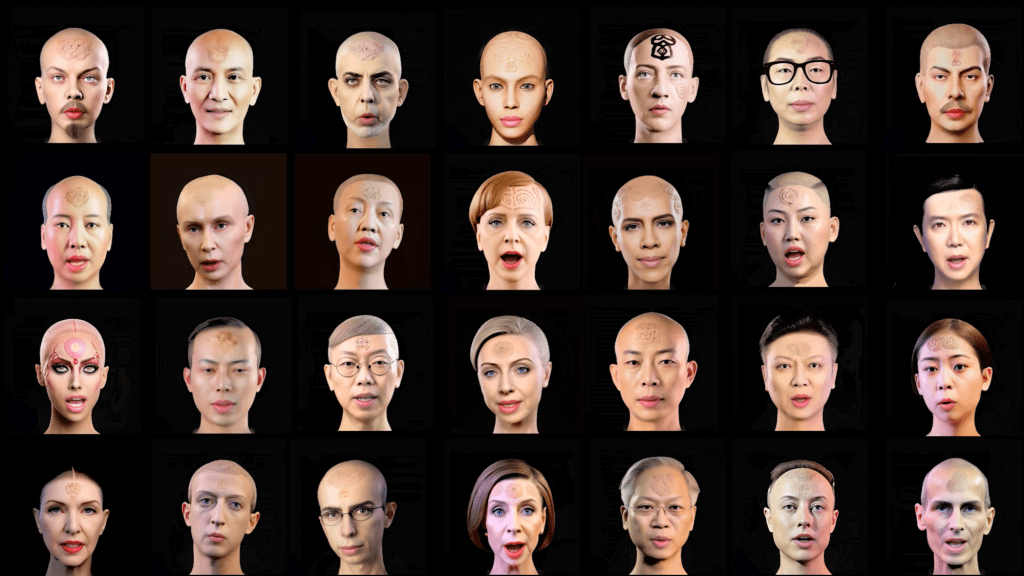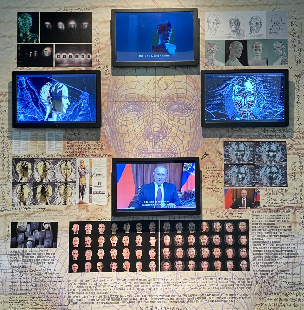 作品中,林珮淳特別挑選具有政治、科技、文化等強權的27位真實人物,第一排中央的則是「夏娃克隆」。以AI Midjourny 軟體將「夏娃克隆」的肖像與這些權威人物肖像結合,而生成出具有兩者瞼部特徵以及額頭上不同的「666」獸印的圖騰。之後,從YouTube 尋找出他們公開演講或說話的影片,從中截取一段最代表他們企圖心的一段語音,再以AI lip sync:D-ID 軟體將這段語音輸入他們的肖像,而再現了這些權威人物說話的內容、聲音與表情,展現了他們的野心與意志。