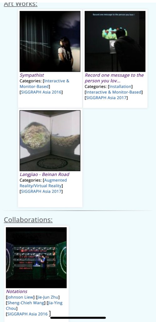 Works from Lin Pey-Chwen Digital Art Lab have been selected for exhibition at the SIGGRAPH Asia Art Gallery, including interactive installations such as “Notations”, “Sympathist”, “Record One Message to the Person You Love”, and the virtual reality piece “Langjiao – Beinan Road”.(https://share.google/uVdGM29So8fsyI3lY)