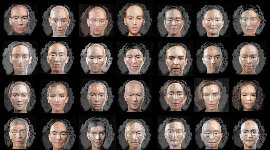 The artwork begins with all 27 figures speaking simultaneously in their native languages, producing a chaotic cacophony. At the center of the first row is “Eve Clone.” Her speech is derived from a segment in the movie Megiddo, where Satan boasts and challenges God (Megiddo portrays an apocalyptic conflict based on the Book of Revelation). The other 27 figures initially deliver their own speeches, but after finishing, they transform into digital grids with curls (resembling Lin’s earlier work that appropriated Leonardo da Vinci’s Vitruvian Man for “Eve Clone’s” grid image) and repeat the same content spoken by “Eve Clone.” The piece concludes with “Eve Clone” delivering the speech solo, making her statement clear and forceful.