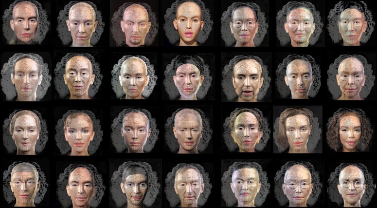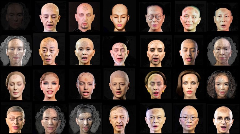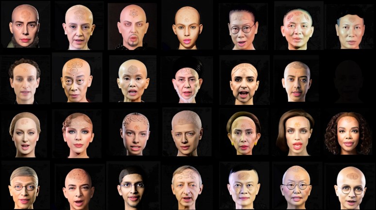 The artwork begins with all 27 figures speaking simultaneously in their native languages, producing a chaotic cacophony. At the center of the first row is “Eve Clone.” Her speech is derived from a segment in the movie Megiddo, where Satan boasts and challenges God (Megiddo portrays an apocalyptic conflict based on the Book of Revelation). The other 27 figures initially deliver their own speeches, but after finishing, they transform into digital grids with curls (resembling Lin’s earlier work that appropriated Leonardo da Vinci’s Vitruvian Man for “Eve Clone’s” grid image) and repeat the same content spoken by “Eve Clone.” The piece concludes with “Eve Clone” delivering the speech solo, making her statement clear and forceful.