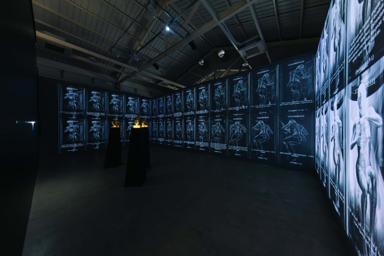 A series of “Eve Clone” images are arranged in a three-screen projection installation in a 冂-shaped configuration. The images gradually evolve from sketches and grid structures to metallic skin textures, eventually forming the proud “Great Image” written in the Book of Daniel— the head of gold, chest and arms of silver, belly and thighs of bronze, legs of iron, and feet partly of iron and partly of clay (Daniel 2:31–33).