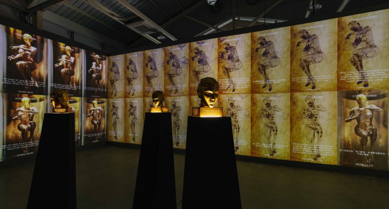 To further depict humanity’s veneration of technology, the work includes three 3D-printed golden head idols of the Eve Clone. When viewers raise their hands to touch the “666” mark on the forehead, the projected Eve Clone images immediately transform into the form of the “Great Image” and begin to lift and move their heads, expressing that the more humanity worships the Eve Clone, the more animated, vivid, and powerful she becomes.