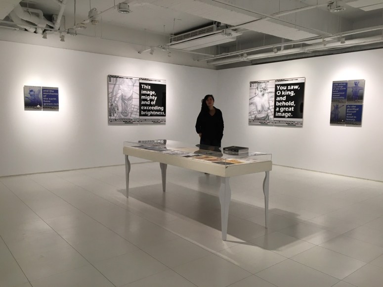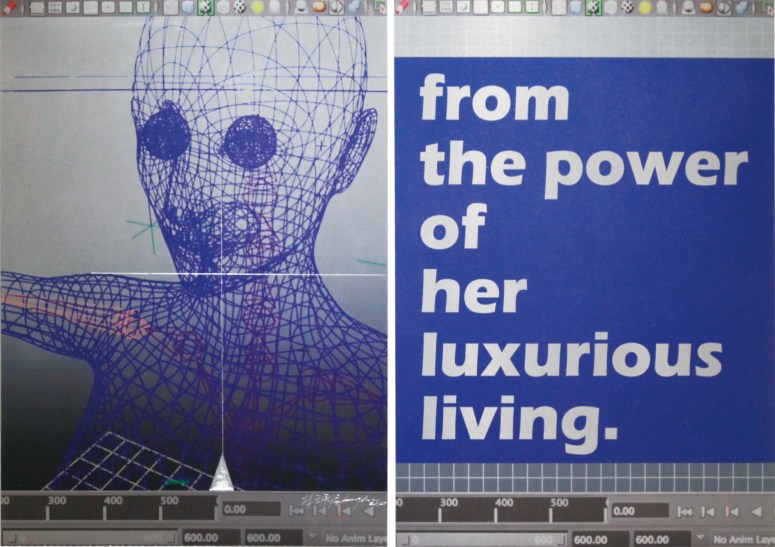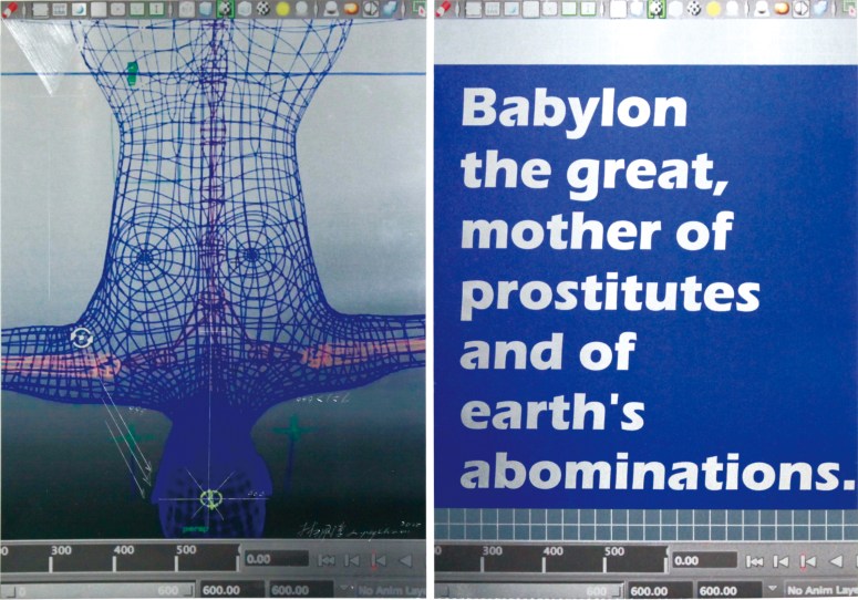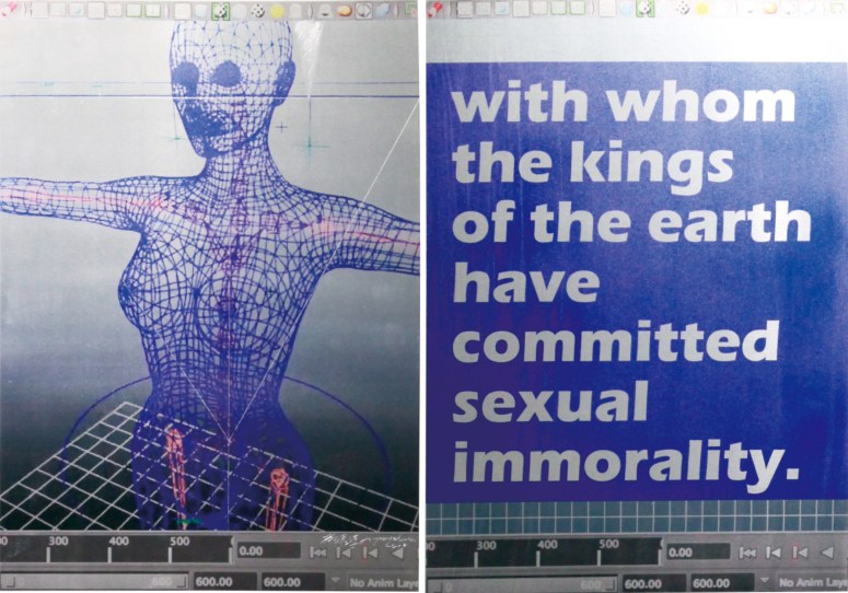 This series prints show six wire-framed body images of “Eve Clone” in six angles excerpted from the video of “Making of Eve Clone I”. Also, the texts about the “Whore of Babylon” were taken from the Book of Revelation to show the identity and ultimate fate of “Eve Clone”. The antithesis of images and texts on the right and left side is to declare the relation between the two. The marks and icons of computer software are purposely kept on the top and the bottom of the prints. The aluminum plate is applied as the media to represent the reflection effect of computer screen. Finally, the symbols and numbers are scraped by hands on the top of the aluminum plate to present multiple-layered symbols and languages.