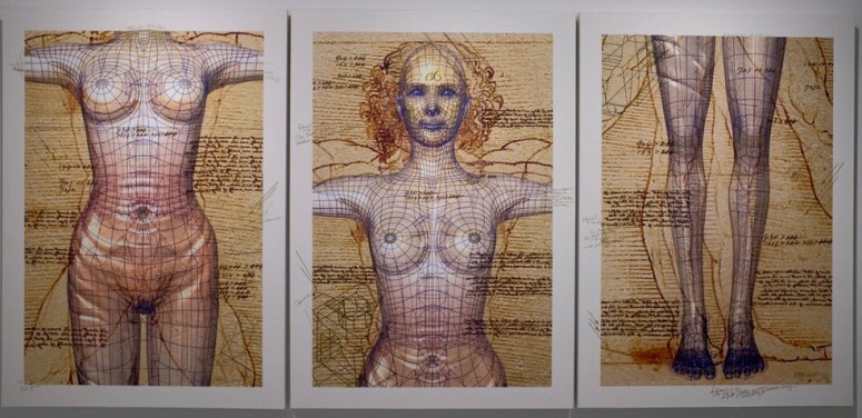 The origin of Documentation of Making of Eve Clone II series is from the animation Making of Eve Clone I. I select three parts of the grid body of Eve Clone such as golden-head with silver-chest, silver-chest with coppery abdomen, iron leg with half iron half mud feet, and combine with Leonardo Da Vinci’s manuscript to emphasize “Great Image”. Then I add signs like computing line sketch, grid, icon, camera, controller…, and create six digital prints with opposite color which is original sketch color and white line on black base. Last, I add my hand-writing annotation to depict the essence of “Great Image.”