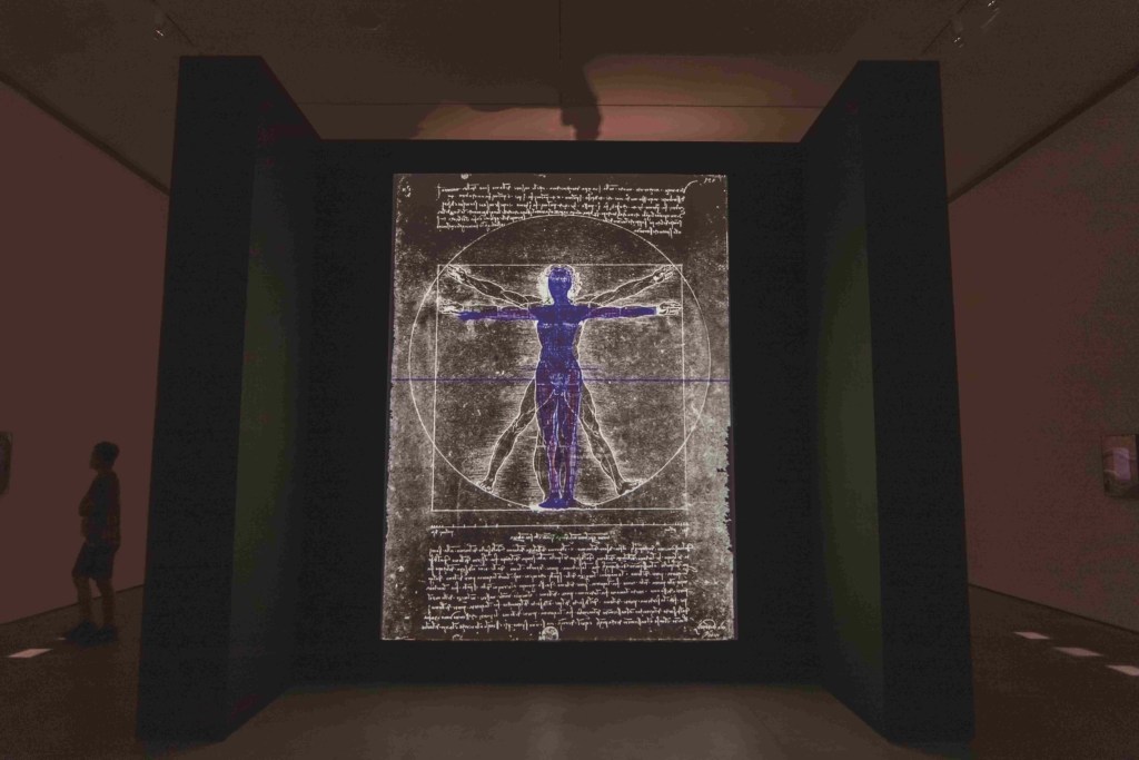 Due to 3D visual illusion, Eve Clone seems to be emerging from Da Vinci’s manuscript into a three-dimensional body. The combination with sound effects creates a sense of mystery and strangeness. In the middle of the video, the artist specifically presents how Eve Clone is examined in the 3D computer space, such as enlarging, shrinking, and rotating through different angles. The computer interface, camera symbols, icons, and timelines are also intentionally preserved to highlight the approach and concept of translating the 3D digitalization process into the making of Eve Clone. In addition, the mirrored writing of Da Vinci’s work has been intricately replaced by Bible verses, which helps to define the destiny and identity of Eve Clone. The artist has offered multi-faceted comparisons and juxtapositions of the Vitruvian Man and Eve Clone: the visual contrast between the graphic manuscripts of the Vitruvian Man and the 3D digital animation of Eve Clone; the overlapping male and female bodies of ideal proportions; the reference of symbols and Bible scriptures. Furthermore, it is possible to compare how de Vinci and Lin, as male and female artists, respectively, created the Vitruvian Man and Eve Clone in a different time and space, with different media, and through their own creative desires.